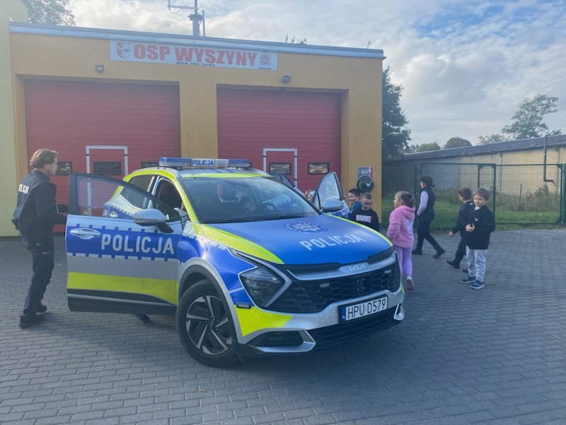 W październiku klasę pierwszą odwiedził pan policjant. Dzieci uczestniczyły w pogadance na temat bezpieczeństwa na drodze a następnie udały się na spacer, podczas którego pan policjant sprawdzał poprawność przechodzenia przez jezdnię. Na zakończenie spotkania dzieci oglądały policyjny samochód. Mogły do niego wejść i posłuchać dźwięku syreny.
