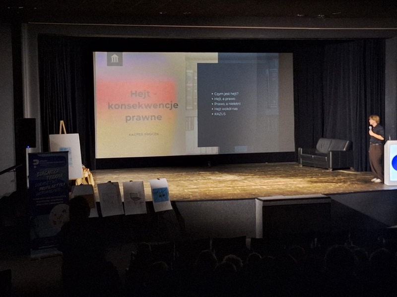 Konferencję rozpoczął energetyczny występ grupy Elite Dance Complex, który wprowadził uczestników w pozytywny nastrój i zachęcił do aktywnego udziału w wydarzeniu. Następnie odbyła się analiza ankiet dotyczących zjawiska hejtu, wypełnianych wcześniej przez uczniów z całego powiatu chodzieskiego – wyniki pokazały, jak często młodzi ludzie spotykają się z nieprzyjemnymi komentarzami czy wykluczeniem. Podczas spotkania młodzież wysłuchała trzech interesujących prelekcji: „Wybieram relacje – nie stosuję hejtu i przemocy” – o budowaniu pozytywnych więzi i reagowaniu na krzywdę innych, „Jak mądrze wykorzystać sztuczną inteligencję w procesie edukacyjnym” – o tym, jak AI może wspierać naukę, a nie zastępować człowieka, „Hejt w Internecie – konsekwencje prawne” – o odpowiedzialności za słowa i skutkach nieprzemyślanych działań w sieci. Udział w konferencji był dla naszych uczniów cennym doświadczeniem i inspiracją do refleksji nad tym, jak ważne jest, by w codziennym życiu – zarówno online, jak i offline – kierować się życzliwością, szacunkiem i odpowiedzialnością.