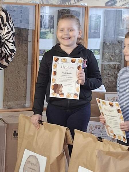 Wśród uczniów klasy I wyłoniła się tegoroczna szkolna i konkursowa rekordzistka Nadia, która zebrała aż 750 kg kasztanów. Natomiast jako szkoła udało nam się zebrać prawie 4 tony kasztanów i żołędzi, a zebrane nasiona zostaną przeznaczone na zimowe dokarmianie zwierząt wolnożyjących na terenie naszego nadleśnictwa.