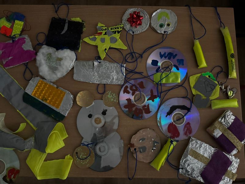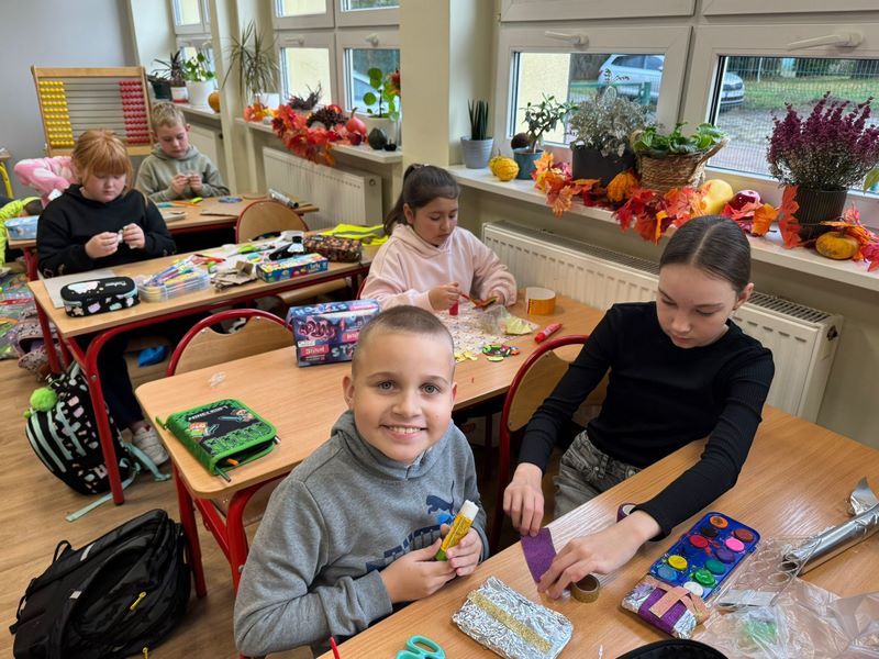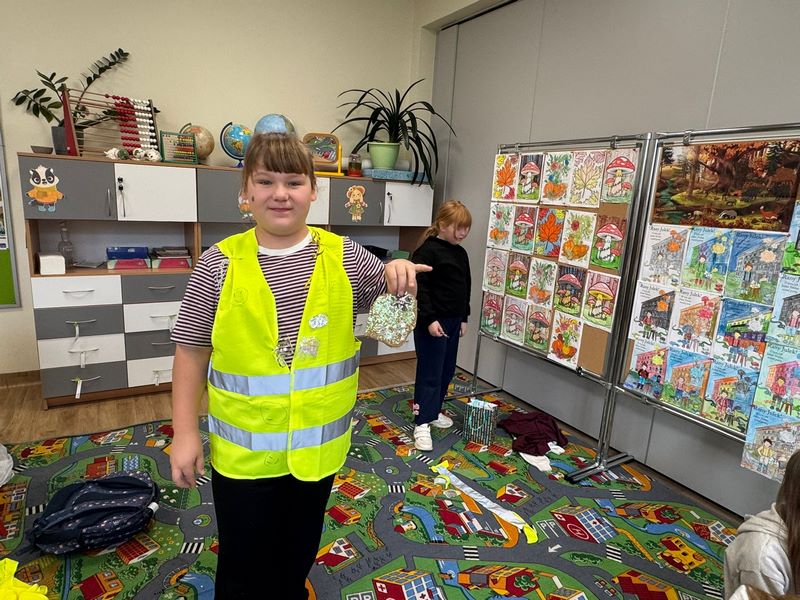 Warsztaty poprowadziły uczennice z klasy piątej, które z dużym zaangażowaniem pomagały młodszym kolegom i koleżankom w tworzeniu różnorodnych odblaskowych akcesoriów. Dzięki ich wsparciu trzecioklasiści mogli uczyć się poprzez działanie oraz współpracę ze starszymi uczniami. Podczas zajęć dzieci wykonywały: breloki, zawieszki na plecaki, kamizelki, zaczepki przypinane do odzieży lub torby. Uczniowie starannie dobierali kolory, kształty i materiały, aby ich odblaski były nie tylko widoczne z daleka, lecz także estetyczne i oryginalne. Towarzyszyły temu rozmowy o zasadach bezpieczeństwa oraz pokaz działania odblasków w świetle latarki. Warsztaty okazały się doskonałym połączeniem nauki, współpracy i zabawy. Trzecioklasiści poszerzyli swoją wiedzę o bezpieczeństwie w ruchu drogowym, a starsze koleżanki świetnie sprawdziły się w roli prowadzących. Stworzone odblaski będą towarzyszyć uczniom w drodze do szkoły, zwiększając ich bezpieczeństwo.