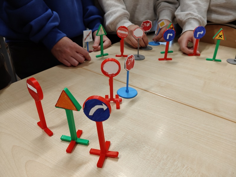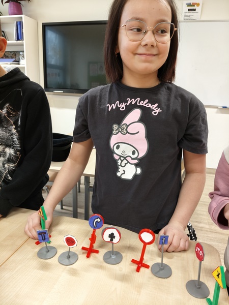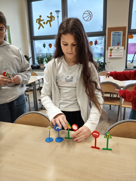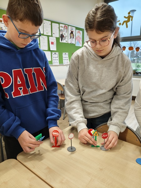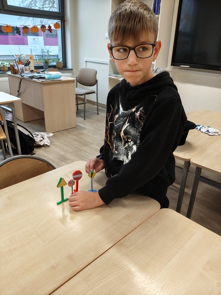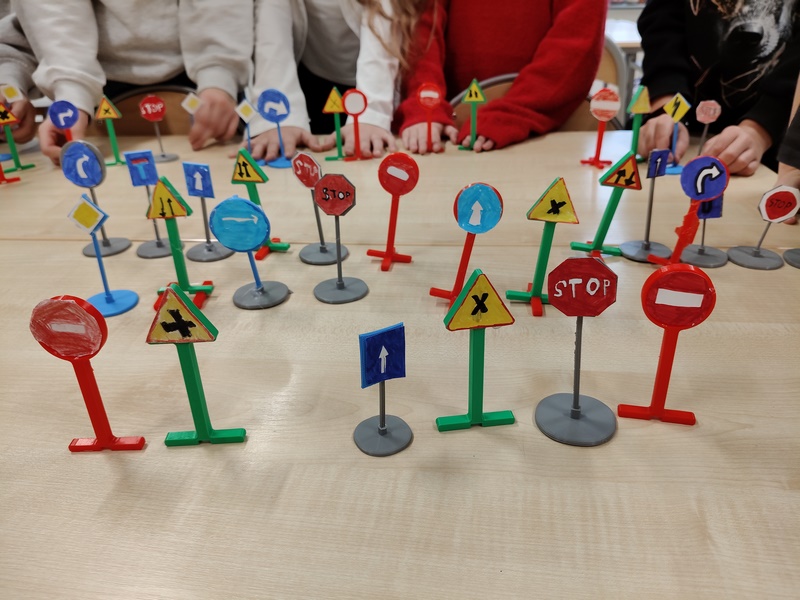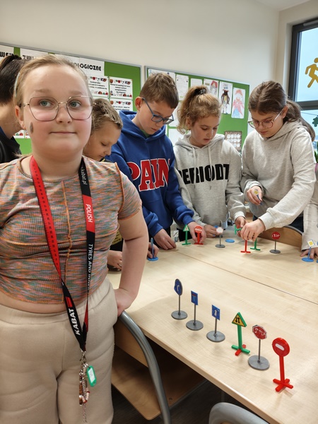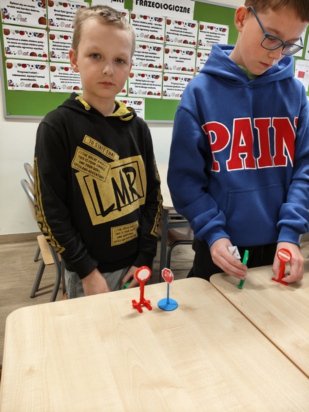 Podczas lekcji czwartoklasiści tworzyli własne mini znaki drogowe, wykorzystując papier, karton, kolorowe materiały, a także specjalne elementy wydrukowane na szkolnej drukarce 3D. Dzięki temu ich prace były nie tylko estetyczne, ale również bardziej realistyczne i trwałe. Każdy uczeń przedstawił swój mini znak, wyjaśniając jego znaczenie oraz sytuacje, w których może pojawić się on na drodze. Pozwoliło to na utrwalenie znajomości symboli drogowych i lepsze zrozumienie zasad obowiązujących pieszych oraz kierowców. Zajęcia były połączeniem nauki, praktyki i świetnej zabawy. Wykonane prace stały się ciekawą ozdobą klasowej wystawy i dowodem na to, że nauka o bezpieczeństwie może być inspirująca i twórcza.
