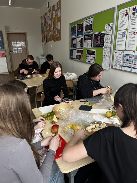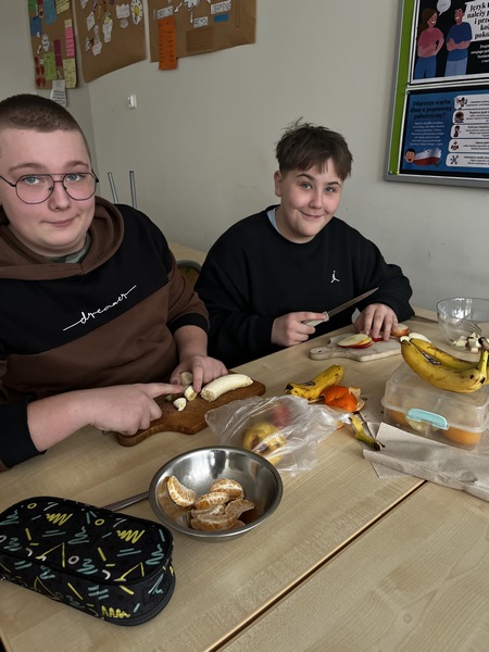 Po słodkim świętowaniu Tłustego Czwartku uczniowie klasy 8 postanowili zadbać o zdrowie i dobre samopoczucie. Podczas lekcji wychowawczej 13 lutego zamienili tradycyjne pączki na kolorowe, pełne witamin sałatki owocowe. Każdy przyniósł swoje ulubione owoce – na stołach pojawiły się jabłka, banany, kiwi, winogrona oraz soczyste pomarańcze. Wspólne krojenie, mieszanie i dekorowanie było nie tylko świetną zabawą, ale także okazją do rozmów o zdrowym odżywianiu. Uczniowie wykazali się dużą kreatywnością, tworząc prawdziwe owocowe kompozycje. Takie zajęcia pokazały, że zdrowe jedzenie może być smaczne, kolorowe i dawać dużo radości. To była doskonała lekcja współpracy oraz dbania o własne zdrowie.